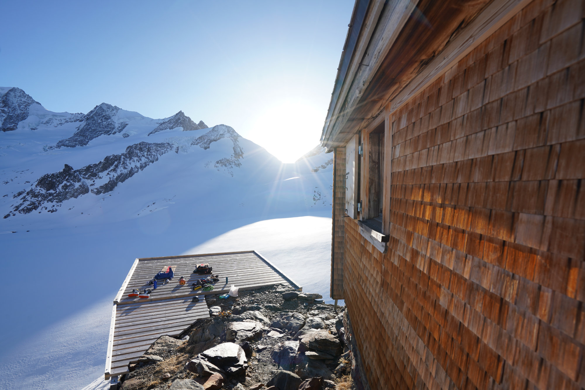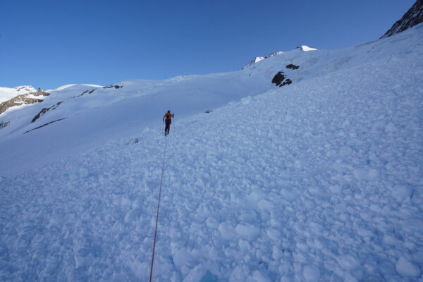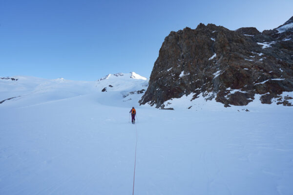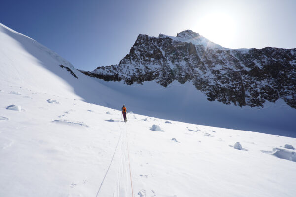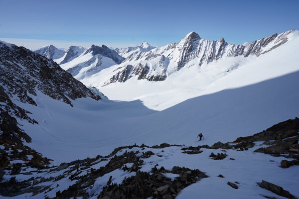 Abstieg über den Grat zum Skidepot und dann Abfahrt über die Aufstiegsroute. Zum Schluss kurzer Wiederaufstieg zur Finsteraarhornhütte.
