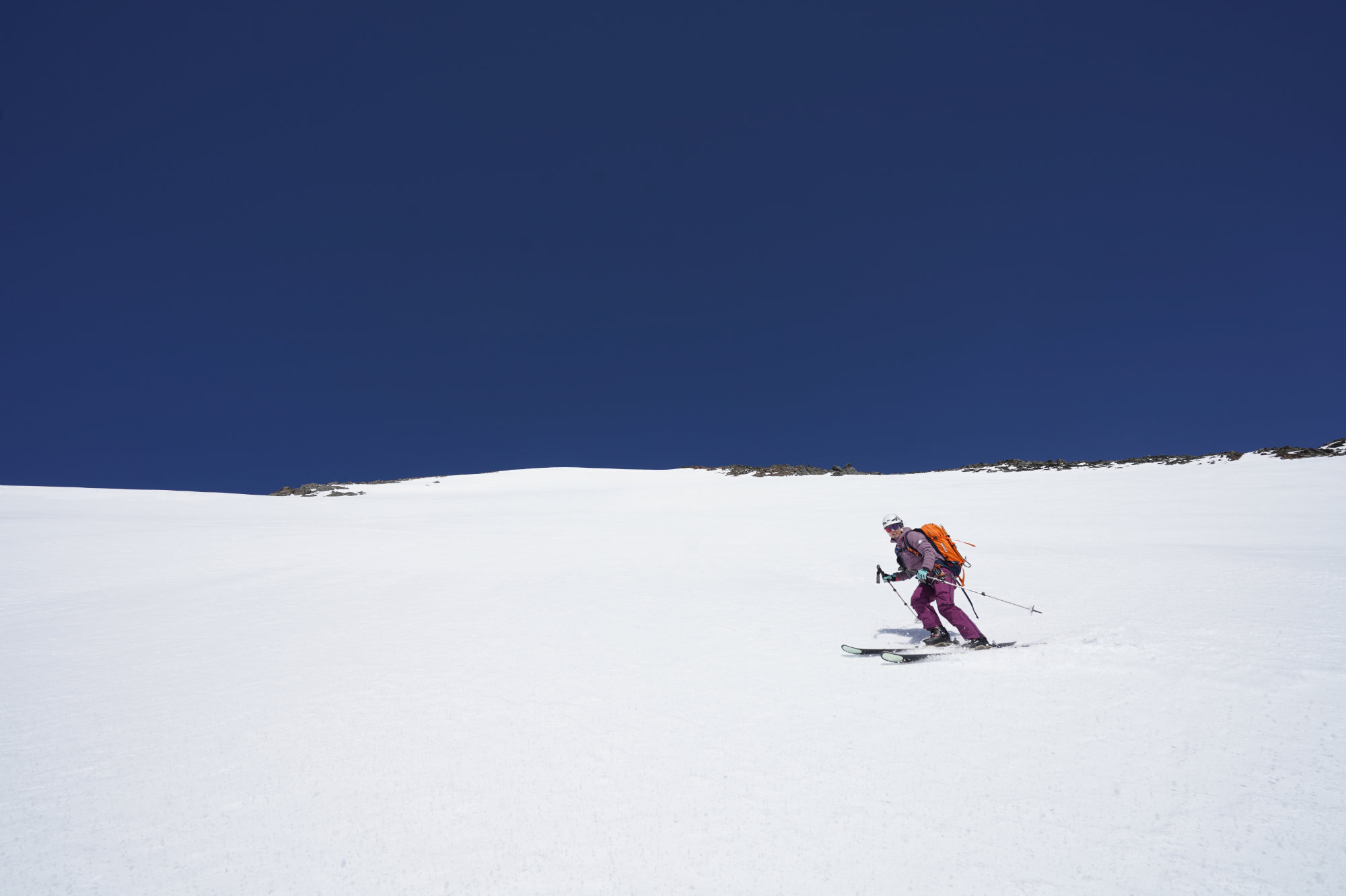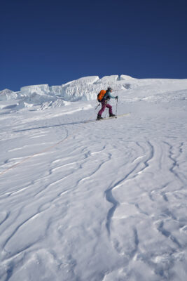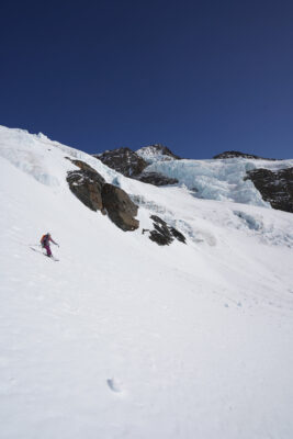 • Abfahrt Gipfelflanke (S-, 39°): Die bis 39° steile Gipfelflanke kann bei optimalen Verhältnissen direkt vom Gipfel befahren werden (ZS+). Vorsicht auf den Bergschrund.