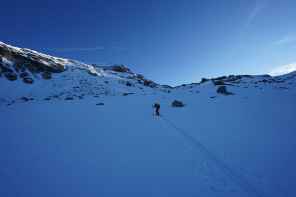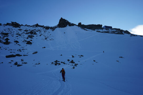 Abstieg zum Skidepot und Abfahrt über die Aufstiegsroute zurück zur Cabane de Tracuit.