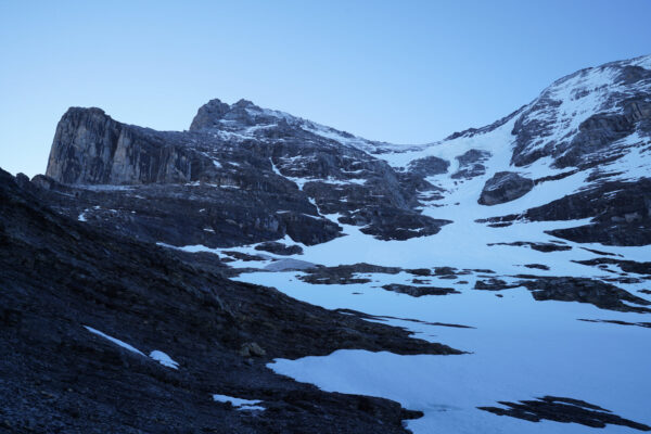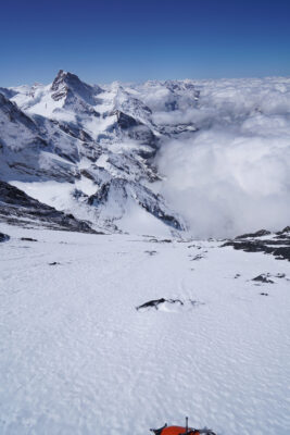 Zwischenzeitlich schaut es so aus, als wäre eine Umgehung links des Sercas nicht möglich, aber dann öffnet sich doch ein perfektes Couloir zum Hochsteigen. Eine Randspalte erschwert den Weiterweg nicht weit unterhalb des Seracs. Ich kann sie aber auf der von unten kommend rechten Seite umgehen, um dann sofort wieder nach links zu queren. Die Exposition wird zunehmend spürbar, meine Waden auch. Um sie zu entlasten quere ich auch immer wieder von Seite zu Seite. Oberhalb des Seracs legt sich die Wand etwas zurück. Ich lege eine kurze Pause ein, kühle aber schnell aus. Bald wird es wieder steiler. Ich quere zurück in die Westflanke und visiere P. 3666 an. Oberhalb dieses Turms wechseln sich die Schneefelder immer wieder mit kleinen Felspassagen ab. Ich mache Skidepot wenig unterhalb von P. 3666. Sorgfältig grabe ich die Ski in den Schnee ein, damit sie auch später noch da sein werden. Noch kann ich mir kaum vorstellen hier später abzufahren, zu steil erscheint die Wand und zu hart der Schnee. Nun suche ich mir einen Weg möglichst immer auf dem Schnee Richtung Gipfel zusammen. Die Eisgeräte greifen gut und solange ich im Schnee bin, geht es problemlos. In den kurzen Felspassagen dazwischen ist meine Konzentration gefordert. Vom Grat quere ich zurück in die Flanke, dort gibt es Schneefelder bis fast zum Gipfel. Ich merke zunehmend die Höhe und werde langsamer, immer wieder muss ich kurze Pausen machen.