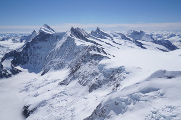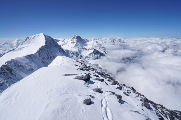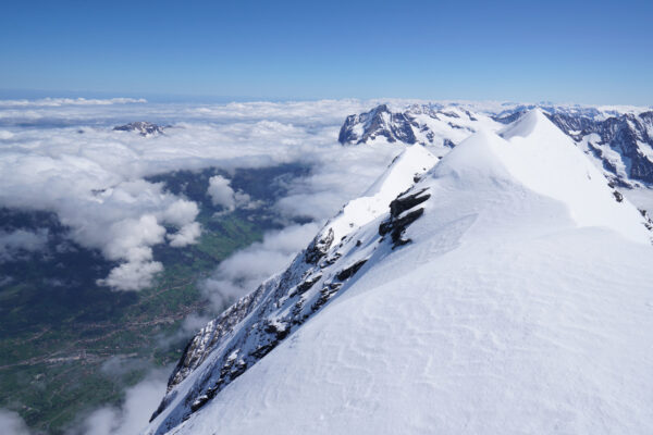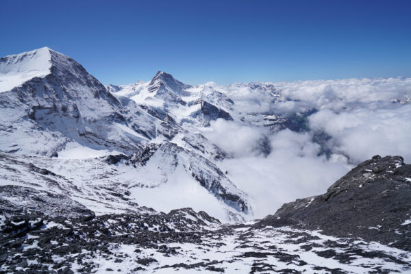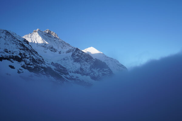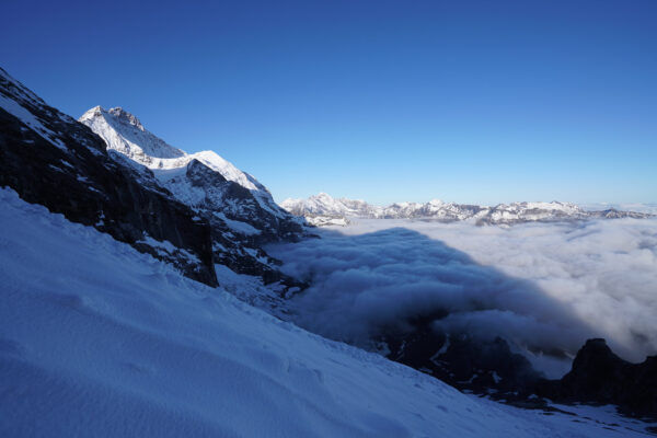 Ich komme an die Wolkengrenze. Jungfrau und Silberhorn erheben sich stolz aus dem Nebel. Wenig später bin oberhalb eines riesigen Wolkenmeers, das sich unter mir erstreckt. Der Schatten des Eigers zeichnet sich als dunkle Pyramide auf den Wolken ab.
