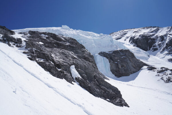 Morgens ist es noch bewölkt. Ich verlaufe mit prompt in der Baustelle bei der Station Eigergletscher und muss wieder absteigen. Froh bin ich, als ich den blau-weiss markierten Wanderweg zum Rotstock finde und mich mithilfe der Fixseile hocharbeiten kann. Bei den ersten Schneefeldern auf etwa 2600 m felle ich erst gar nicht an, der Schnee erscheint viel zu hart. Im Zick-Zack geht es hoch, immer wieder breche ich ein, aber zum Glück nur streckenweise. Langsam gewinne ich Höhe in Richtung des grossen Seracs in der Wand.
